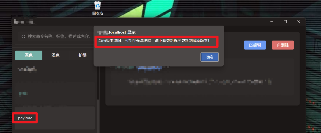5.点击payload标签栏,触发xss代码弹窗,提示版本老旧,存在漏洞风险更新