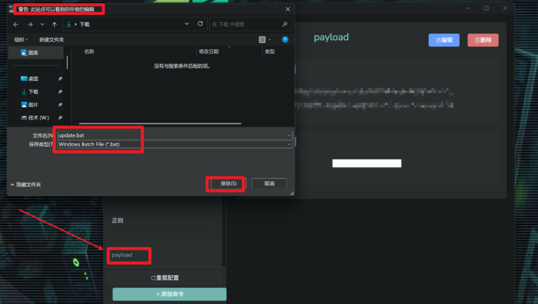 - 点击payload标签栏,就能触发xss代码,自动弹窗资源管理器,保存update.bat文件,但是这一步需要用户确认保存