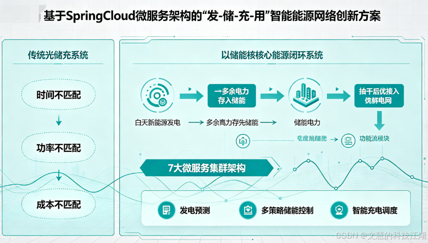但大家可能没意识到,这根本不是简单的硬件拼凑,而是一套需要精准控制、实时决策的复杂能源系统。要让这个"不浪费、补短板"的完美逻辑真正落地,我们必须有一个强大的分布式"超级大脑",而SpringCloud微服务架构,就是最适合打造这个大脑、实现完整能源闭环的技术方案。