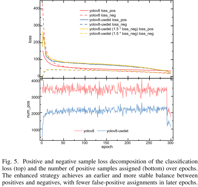 Figure 5的正负样本分解分析显示:原始YOLOv8s训练需要约150个epoch才能让负样本损失稳定,而YOLOv8s-uwdet在约50个epoch即实现稳定平衡。下图还直观展示了一个问题:原始方法在训练后期(mosaic增强关闭后)正样本分配数量反而增多,存在大量假阳性;而DTJA从一开始就以较少但更精准的正样本引导优化,始终维持更干净的分配质量。