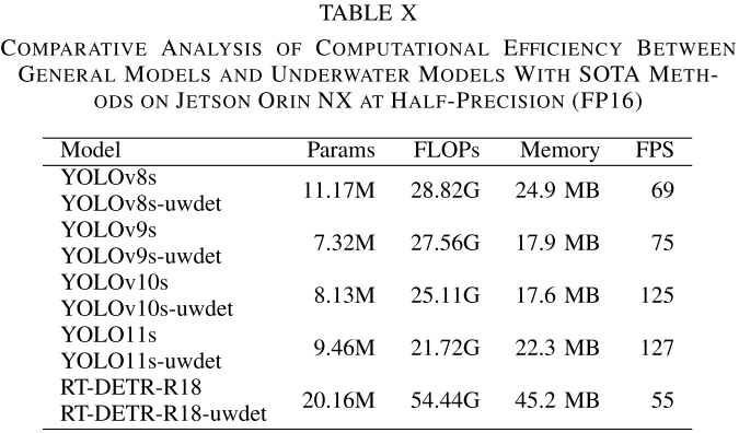 Table X则证明了所有"-uwdet"版本与对应基线的参数量、FLOPs、内存占用和FPS完全一致。以YOLOv8s为例,参数量11.17M,FLOPs 28.82G,内存24.9MB,FPS 69,与YOLOv8s-uwdet完全相同,而检测精度则显著更高。