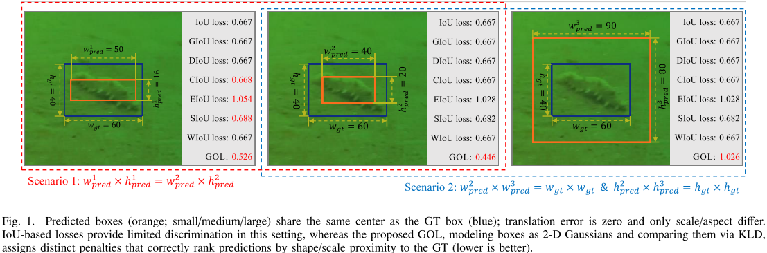 【配图:论文 Figure 1】IoU变体与GOL的对比示意图。图中展示了当预测框与GT框中心对齐、仅形状/尺度不同时,IoU/GIoU/DIoU/WIoU等损失值完全相同无法区分优劣,而GOL能给出有差异的惩罚值,正确排列预测质量。