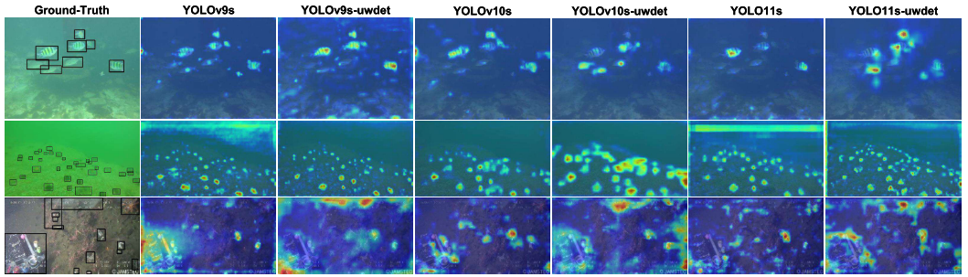Figure 2的定性结果显示,增强模型在多种复杂场景下均显著减少了漏检和误检。YOLO11s-uwdet在复杂场景下漏检率较原始YOLO11s降低50%。Figure 3的类激活可视化揭示了机制层面的变化:"-uwdet"版本的热力图在目标区域更为集中和清晰,背景噪声和水中伪影的响应明显受到抑制。