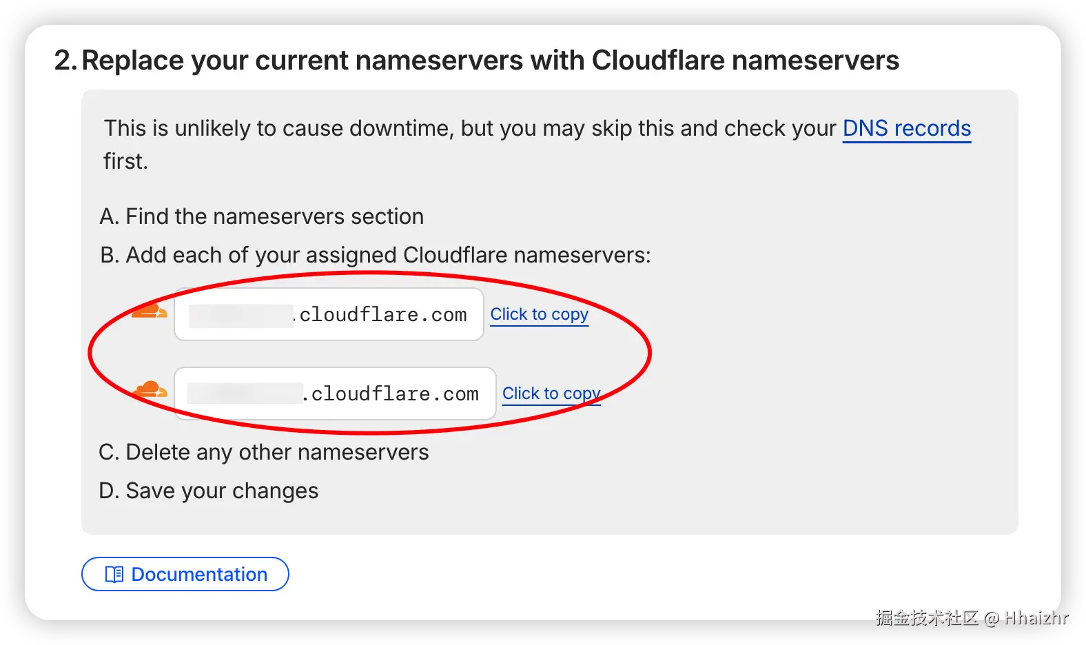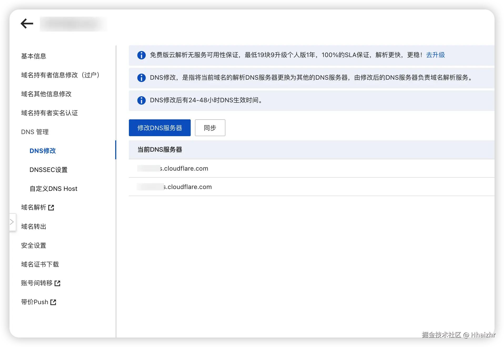关键一步 :此时页面会显示出两个分配给你的 名称服务器 (Nameservers) (例如