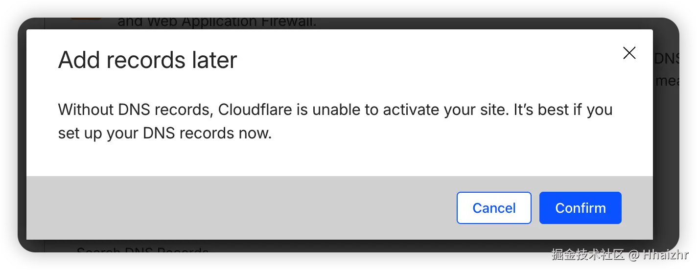 Cloudflare 会自动扫描你现有的 DNS 记录,不管它扫出了什么,或者什么都没有,直接点击底部 Continue to activation。然后点击 Confirm