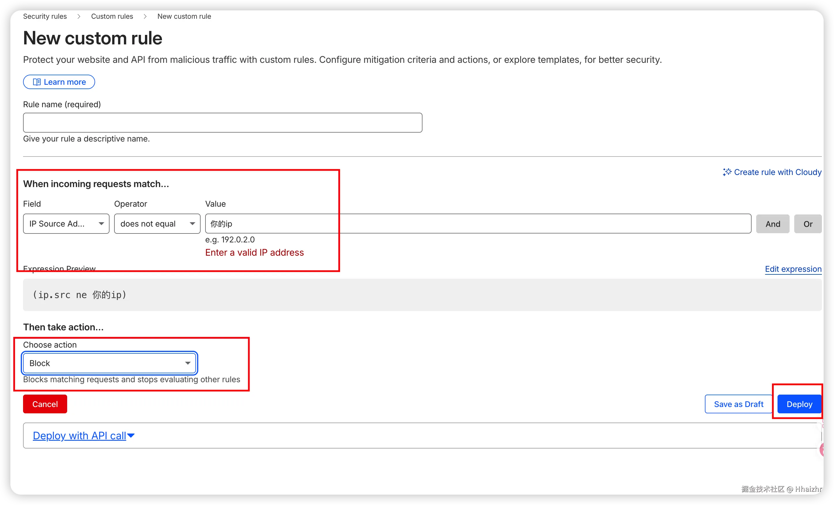 这条规则的意思是:如果发出请求的设备 IP 不是我们设置自己专用的 IP,WAF 就直接将其流量掐断。 这样一来,就能从根源防止转发接口被他人滥用盗刷。