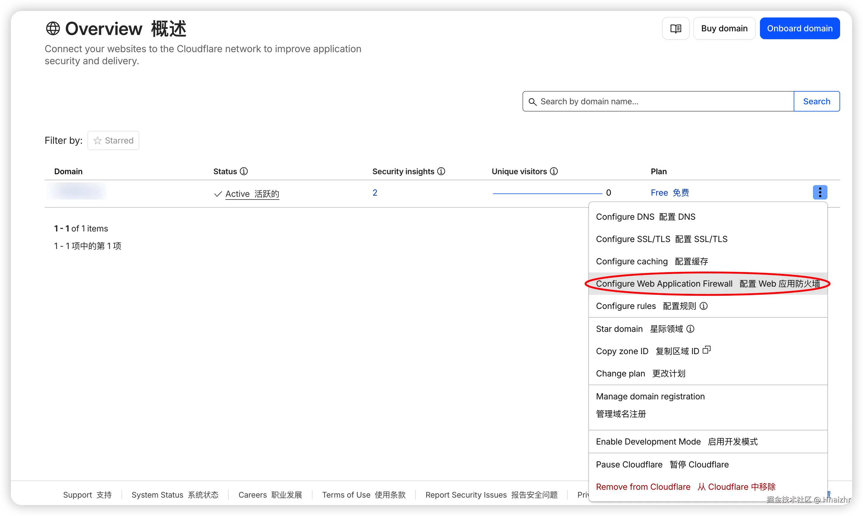 在左侧菜单找到安全性相关配置,点击 Configure Web Application Firewall 。