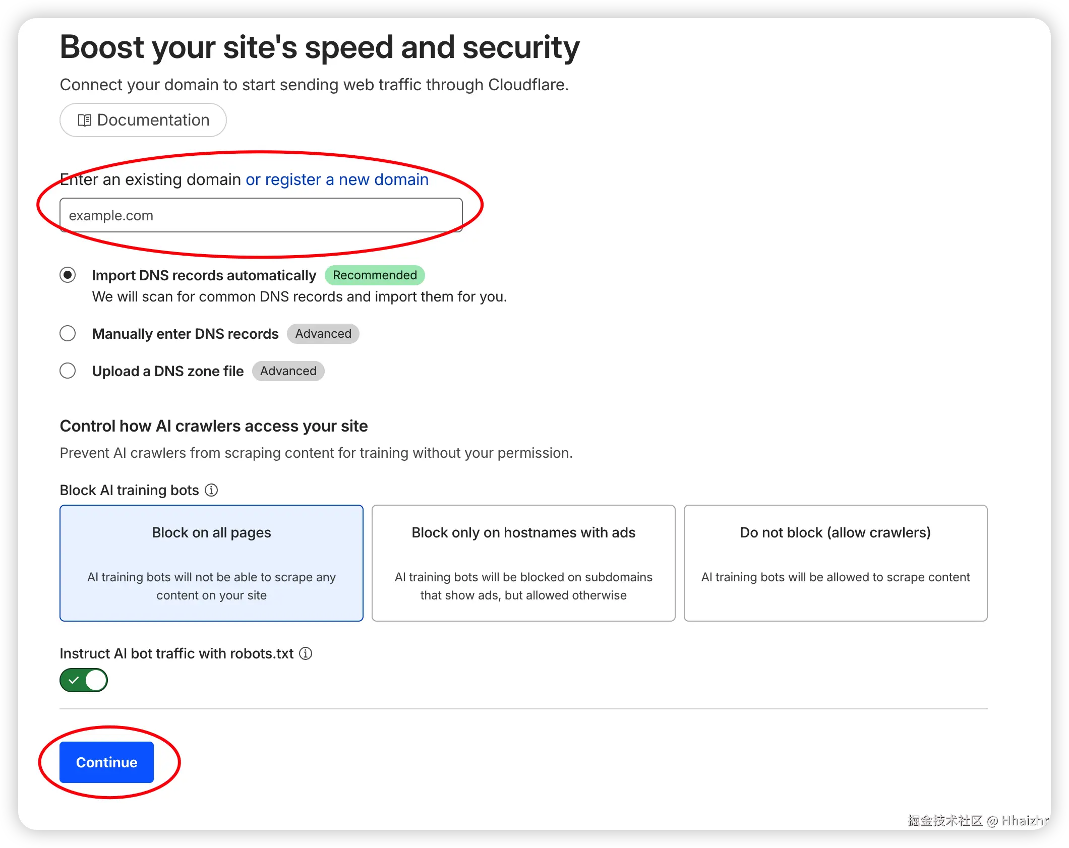 example.com,不要加www也不要加api),点击 Continue。