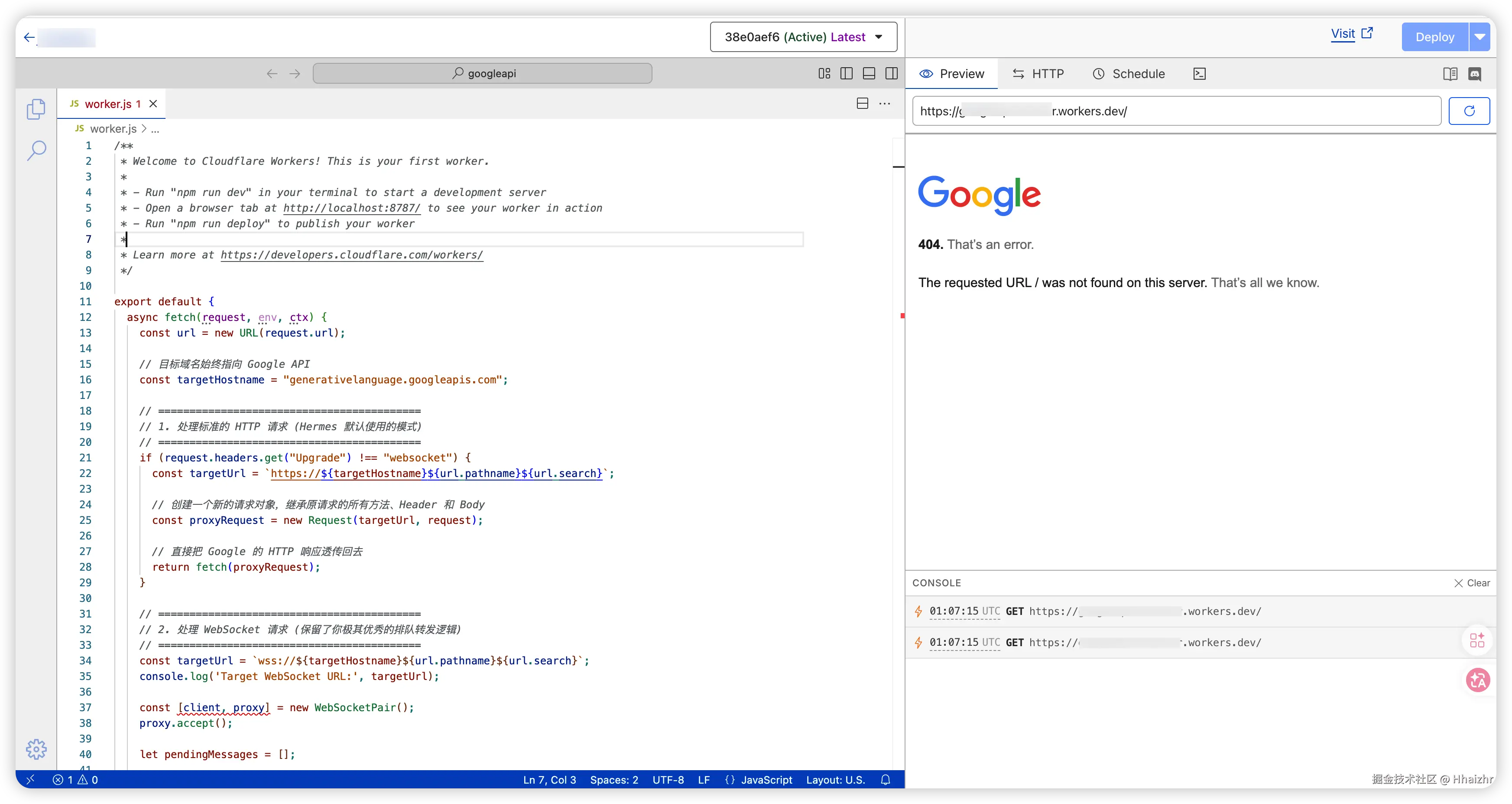 Deploy 之后,点击右上角的 Edit code,把示例 Worker 里的默认代码删掉,替换成一段 API 请求转发脚本(在 GitHub 上能找到很多极简代码)