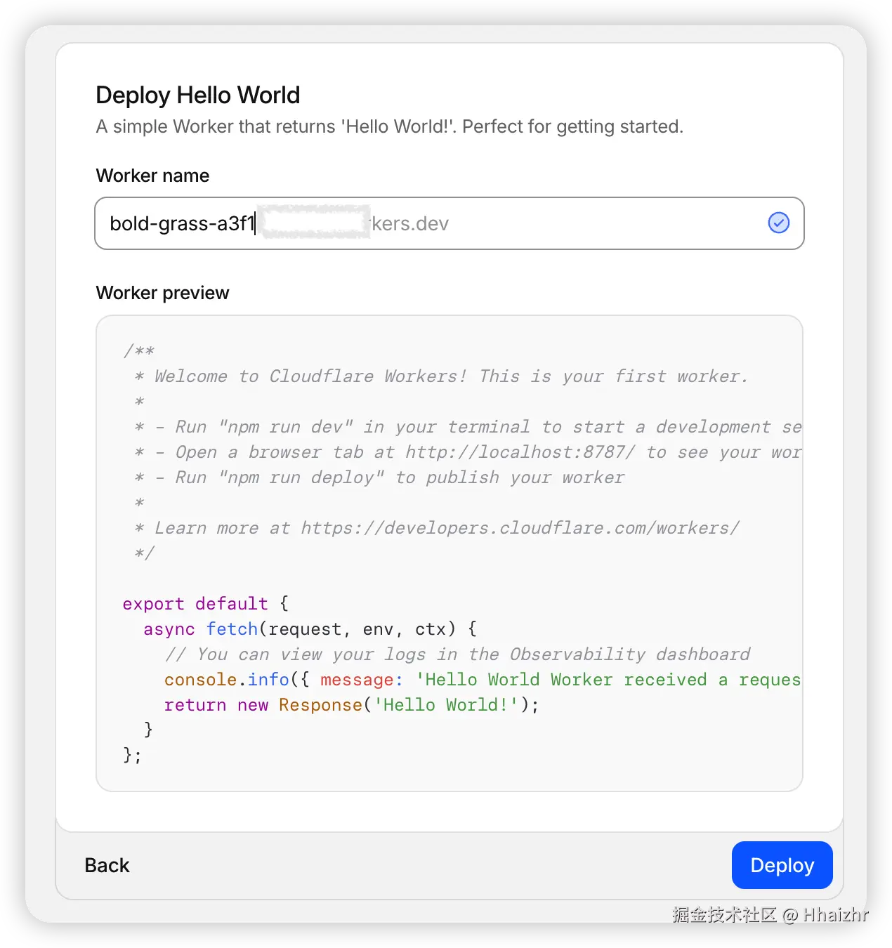 点击 Start with Hello World!会给出一个示例 Worker