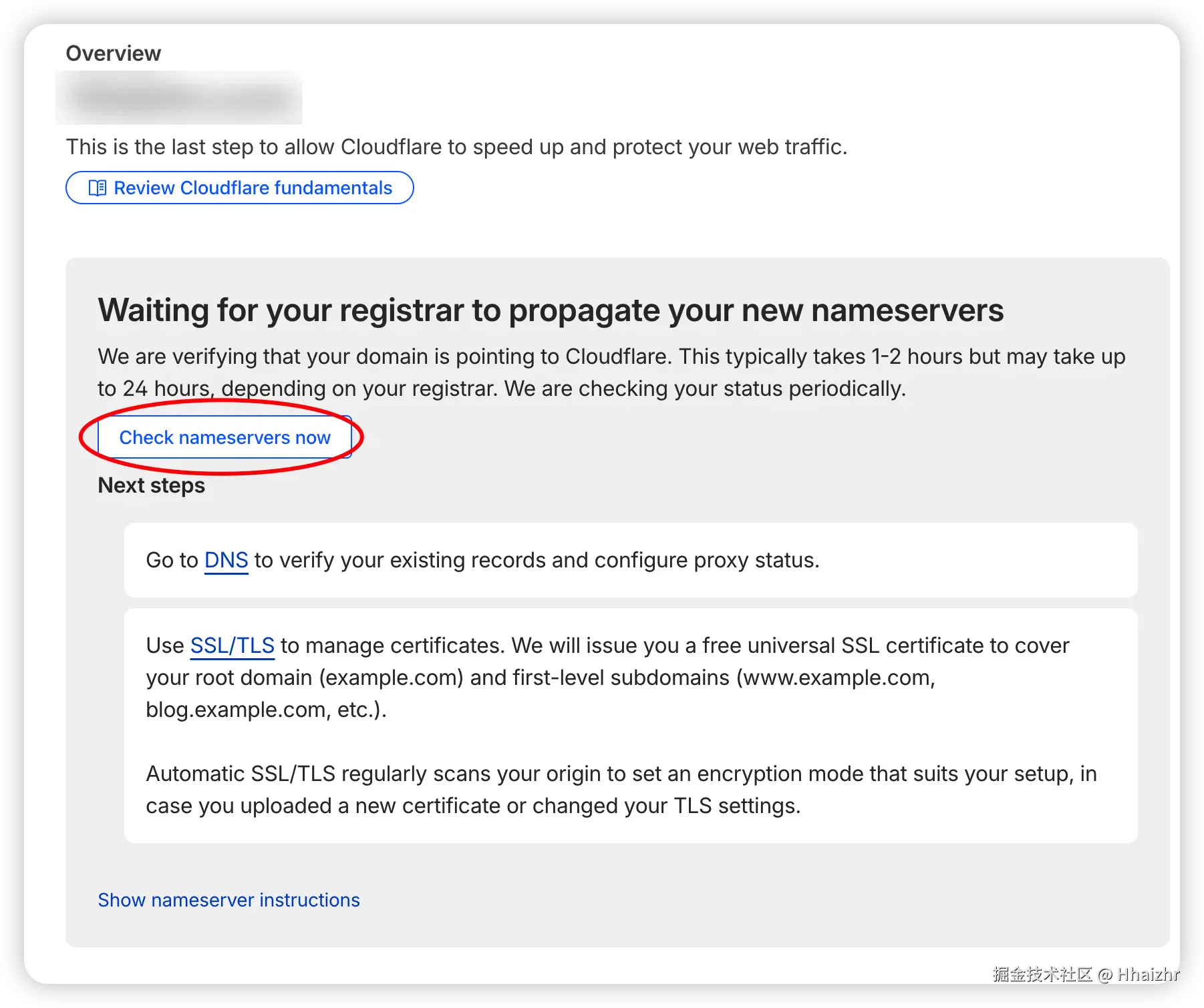 回到刚才的 Cloudflare 页面,点击 "Check nameservers" (检查名称服务器) 。
