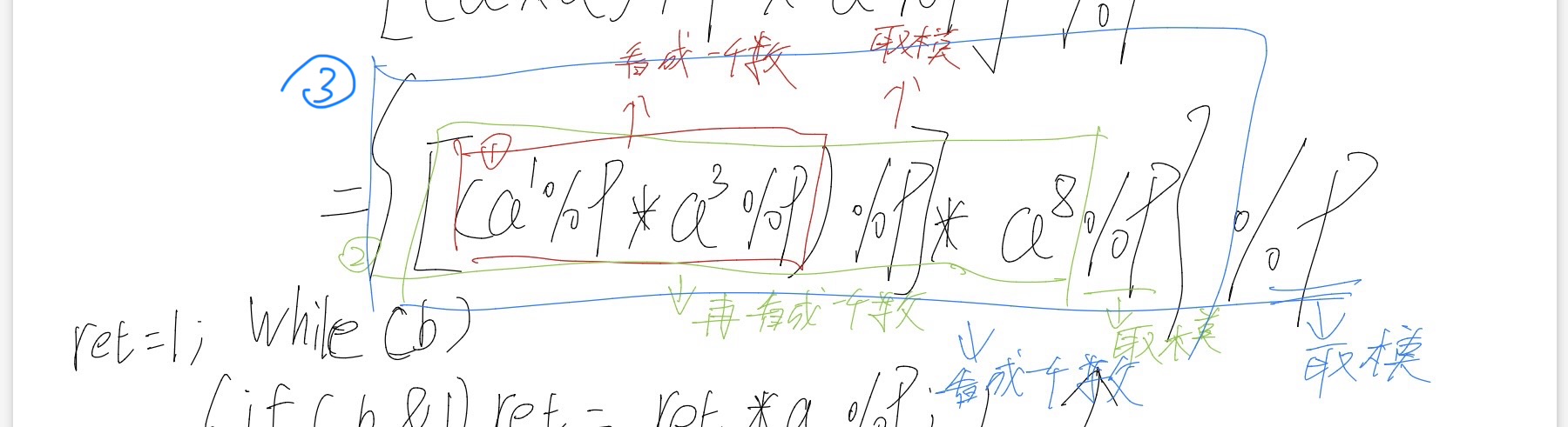 a的多少次方必须有个%p然后每两个(假设)a^1%p * a^2%p他相当于套了层括号得把他看成一个数[a^1%p * a^2%p]你想把他还原回(a^1 * a^2) %p. 必须再%个p[a^1%p * a^2%p] % p这个也就相当于为什么要ret = ret * a % p这么写的原因 因为代码其实更像是ret = (ret * a) % p就是每套层()把他看成一个数字 就要一个%p当然我说可能还是看不懂 可以自己试着结合例子 推推看!