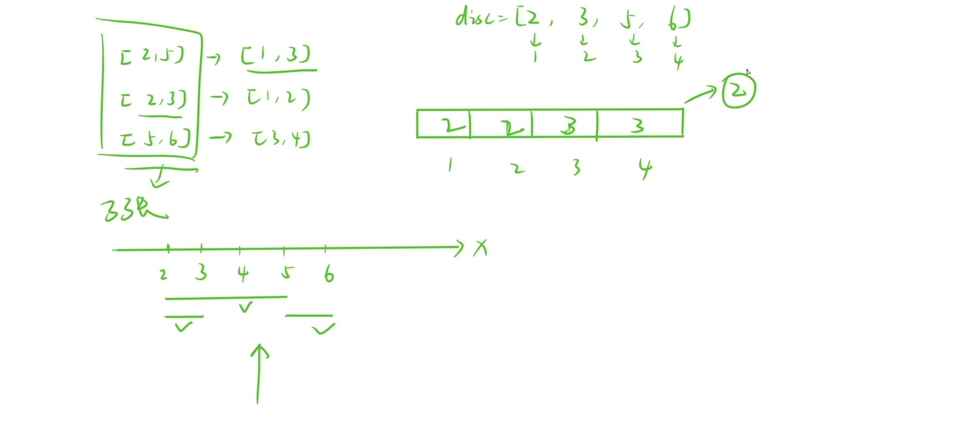 离散化操作会把区间缩短,从而导致丢失一些点。在涉及「区间覆盖」问题上,离散化会导致「结果出错」。比如我们这道题,如果有三个区间分别为:([2,5],[2,3],[5,6]),离散化之后为:([1,3],[1,2],[3,4]),区间覆盖如图所示: