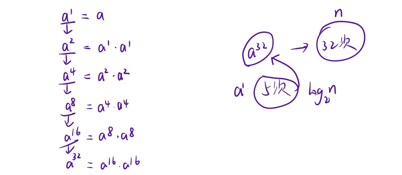 a^32正常求需要 跳32次(利用循环不断a*a*a*a.....*a)!但利用倍增只需要5次!