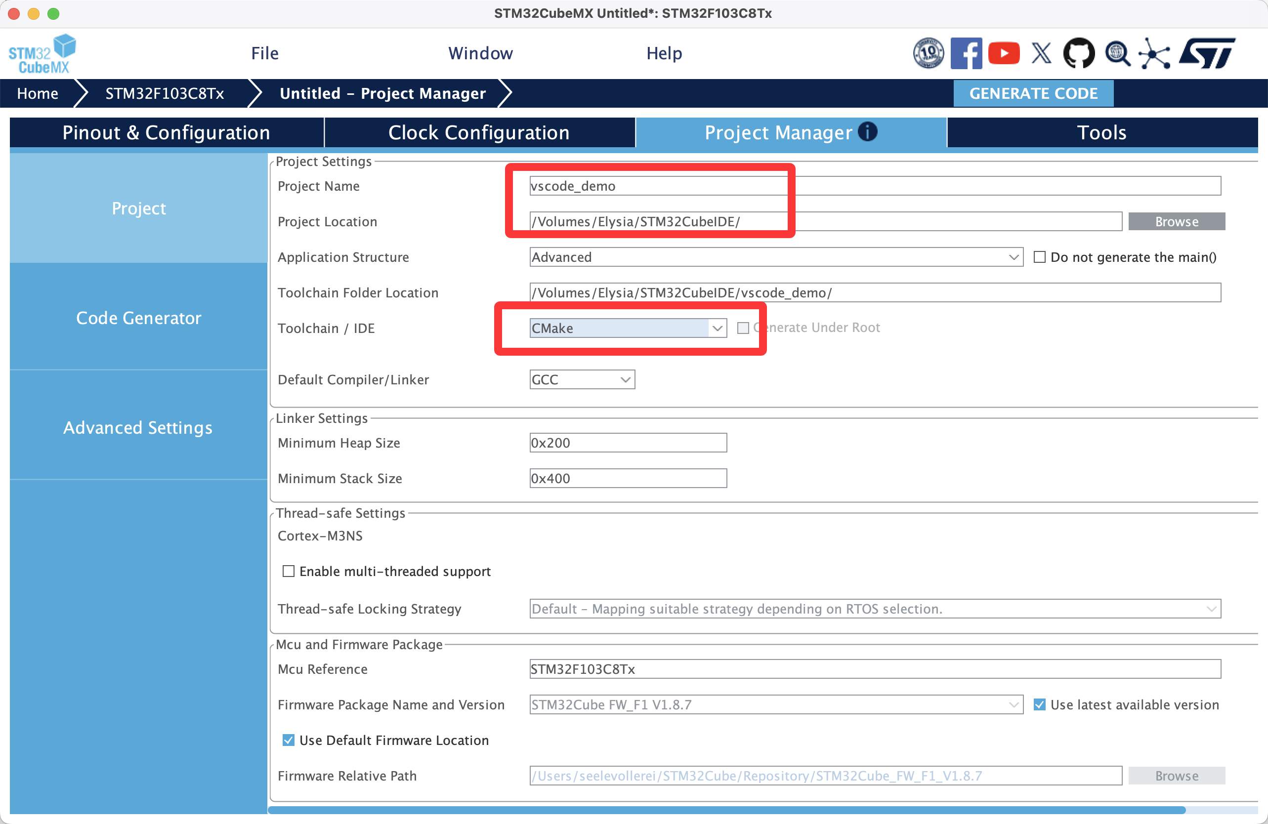 来到Project Manager,设置项目路径(上一层目录,因为要在这里创建子文件夹)和名称,默认会帮你创建一个文件夹