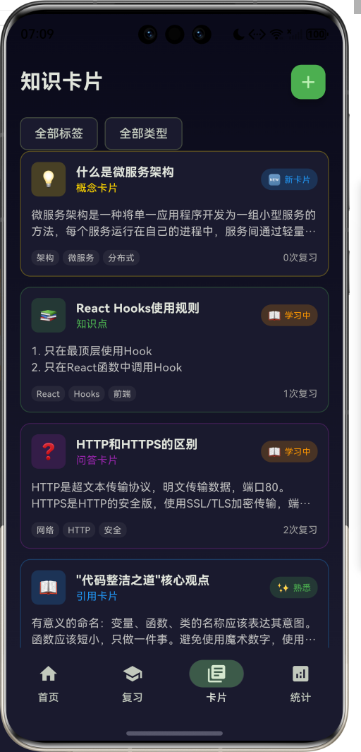 │ 📚卡片 📖复习 🏷️标签 📊统计 │