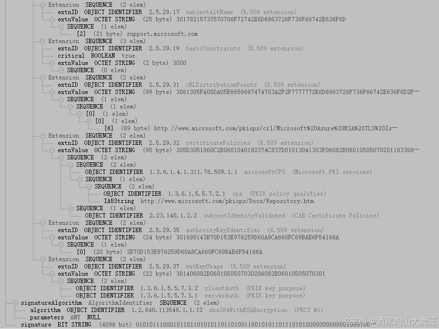 - 解析后可以得到:algorithm OBJECT IDENTIFIER 1.2.840.10045.4.3.2 ecdsaWithSHA256 (ANSI X9.62 ECDSA algorithm with SHA256)