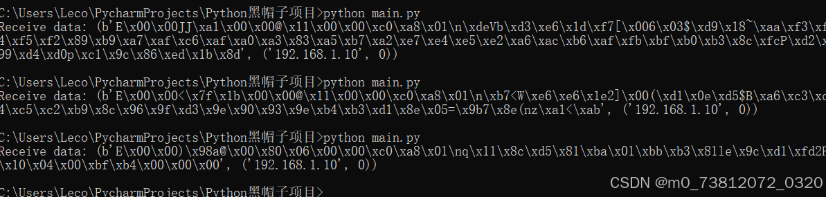 recvfrom(65565):调用 recvfrom 方法接收数据。65565 是缓冲区大小,足够容纳目前最大可能的 IP 数据包。