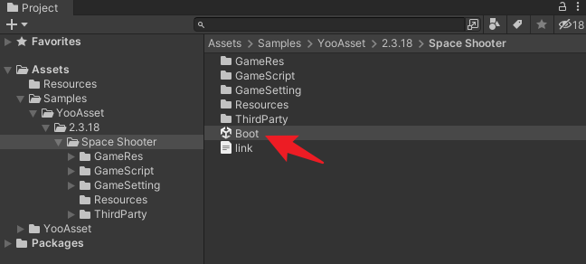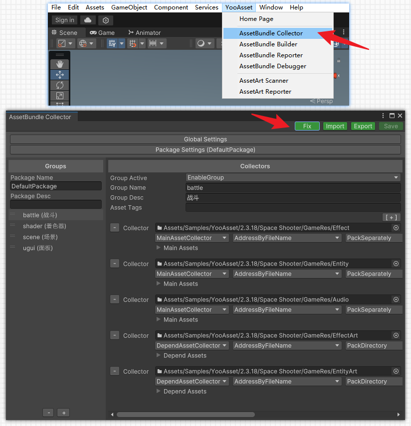第一步:Space Shooter在导入完成后,打开YooAsset->AssetBundle Collector 窗口。