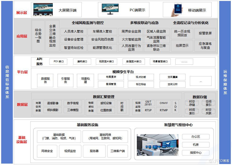 以视频孪生技术为核心纽带,构建统一的数字化底座,打破数据孤岛,实现"一图统管",支撑业务创新与管理升级。构建"1+1+1+N"总体架构,深度贴合燃气枢纽设备密集、风险点多、作业流程规范的行业特点,实现燃气场站数据、场景、业务的深度融合,打造全域感知、全链协同、全时研判的专属智慧管理体系,为各类燃气业务应用提供坚实的技术与数据支撑。