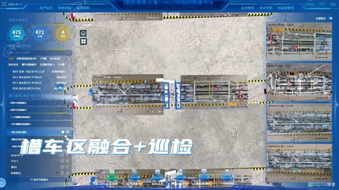 针对燃气场站罐区、管线廊道、高空设备等复杂高危场景,依托视频孪生平台融合设备状态、运行工况与电子作业票信息,动态生成差异化巡检策略,实现一键自动巡航与 AI 视觉智能识别,全面覆盖管线防漏、装卸车合规核查、储罐安全监测等核心巡检场景。以自动化巡检替代人工现场排查,显著降低高危作业风险。