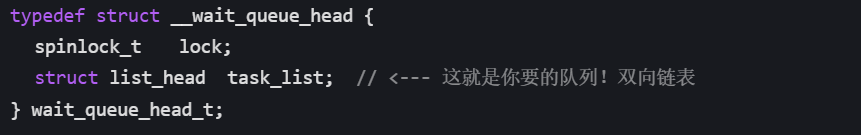 如果我们想看这两个队列的底层实现其实在 VS Code 里,是无法通过"转到定义"看到这两个真实的队列,因为它们不在用户态头文件里,而是藏在 Linux 内核内部,用户态代码完全看不到。所以我们只能在它 Linux 内核源码里查看。