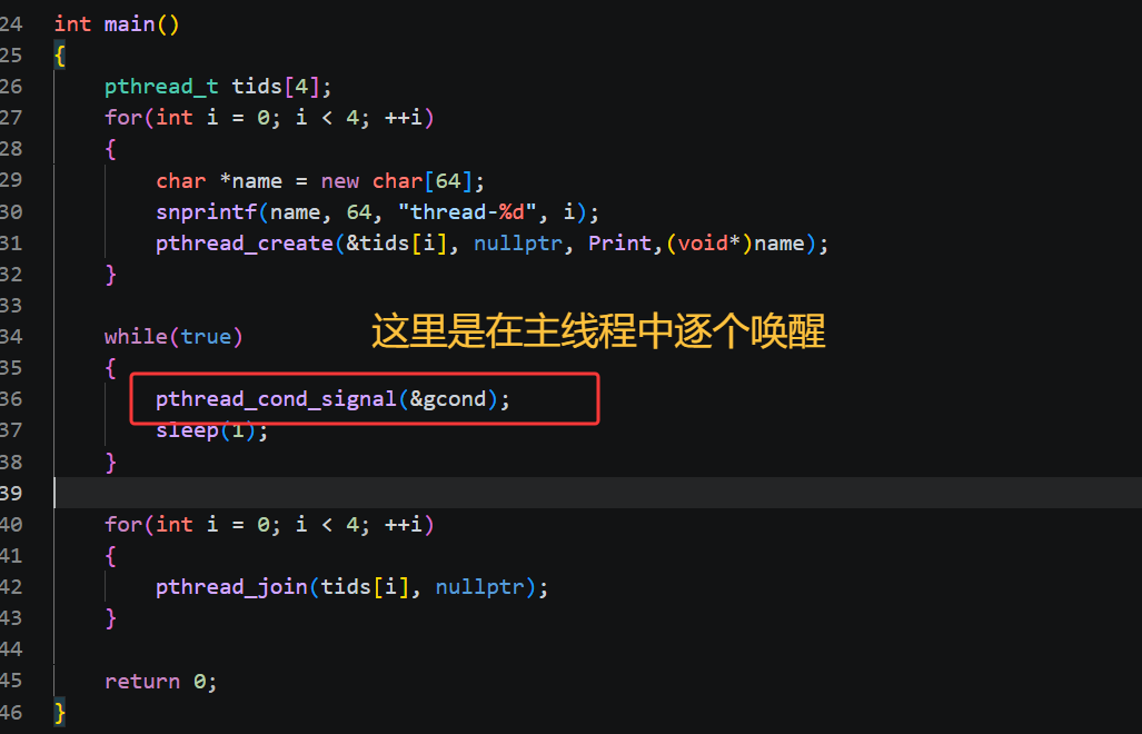 pthread_cond_signal 是一次性从条件变量的等待队列里唤醒一个线程,对应 C++ 标准库的notify_one,代码里主线程循环调用 pthread_cond_signal,就会每次只唤醒 4 个休眠线程中的一个,被唤醒的线程会退出条件队列去争抢互斥锁,抢到锁后 pthread_cond_wait 函数返回,执行后续打印、解锁逻辑,没抢到锁的线程继续在锁阻塞队列排队,最终实现 4 个线程轮流打印的效果;