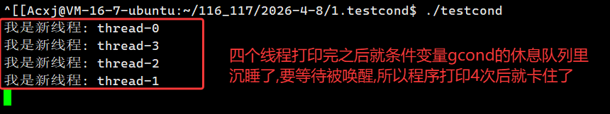 - 对应我们代码:4 个线程执行 pthread_cond_wait 后,全部被内核挂到 gcond 的条件等待队列链表上,永久休眠,直到被唤醒。