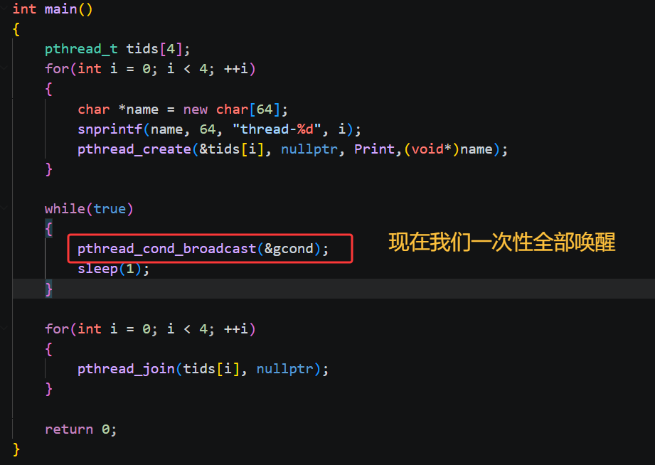 pthread_cond_broadcast 默认唤醒**所有正在该条件变量上等待的线程。**把条件变量等待队列里的所有阻塞线程全部唤醒,让它们重新参与互斥锁的竞争。