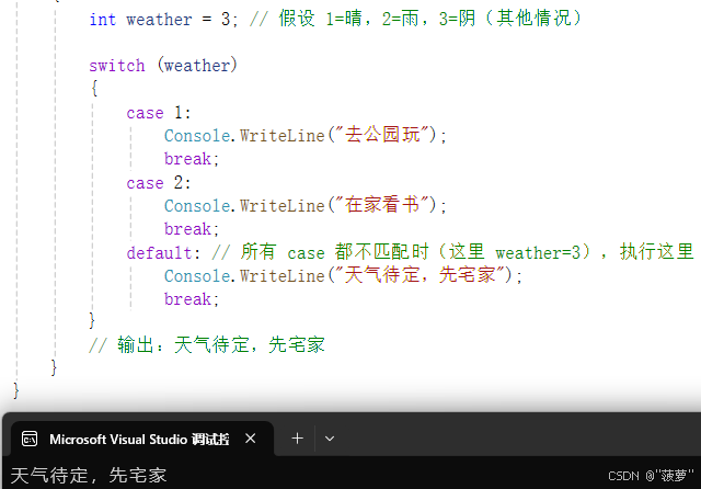 default: // 所有 case 都不匹配时(这里 weather=3),执行这里