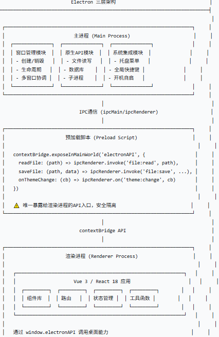 │ └── renderer/ # 渲染进程(Vue3/React)