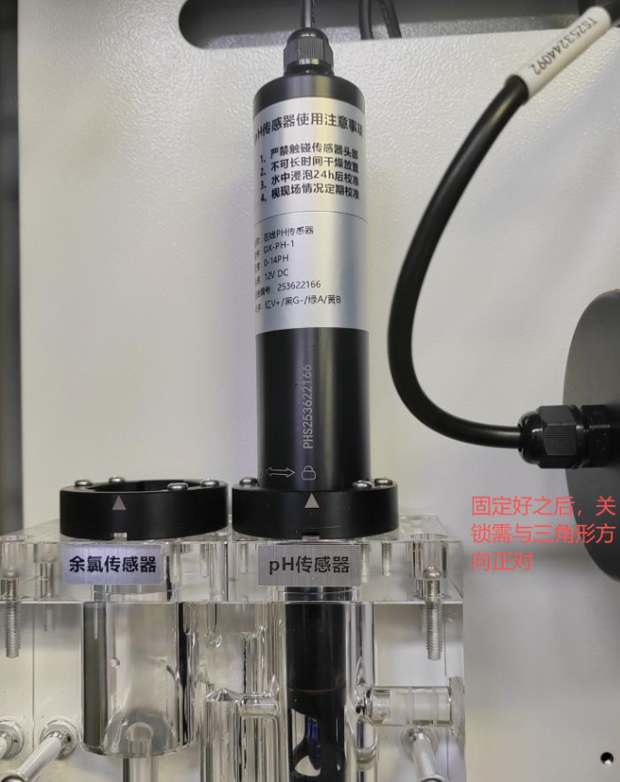 安装人员轻开设备上盖,探头玻璃球泡区域禁止直接触碰,防止感应部件受损。pH、余氯等探头按标识对准流通槽三角标记,垂直缓慢放入后向左旋转锁止,安装位置与密封性被精准控制。机箱内预留线缆按线序规范连接,配套砂纸妥善留存,用于后期探头校准与维护。