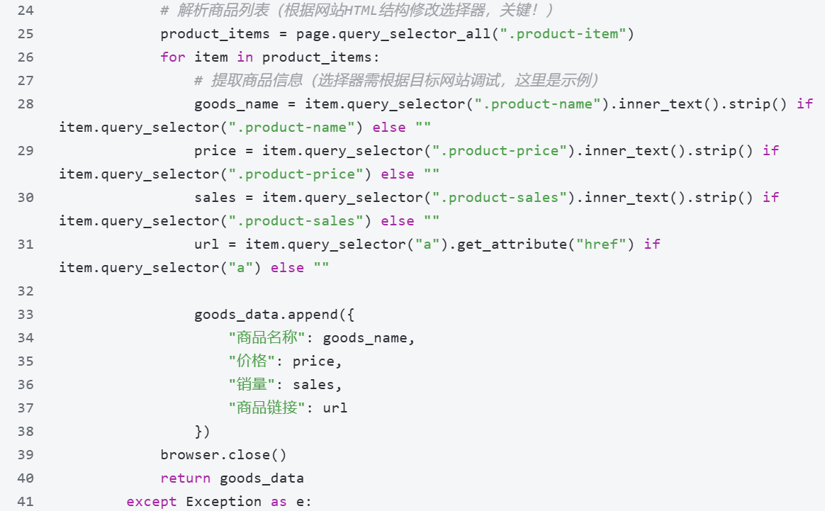 关键提示:爬虫的核心是"匹配网站HTML结构",需通过浏览器F12查看目标元素的class、id,修改代码中的选择器(如.product-item、.product-name),这是定制化爬虫的核心步骤。