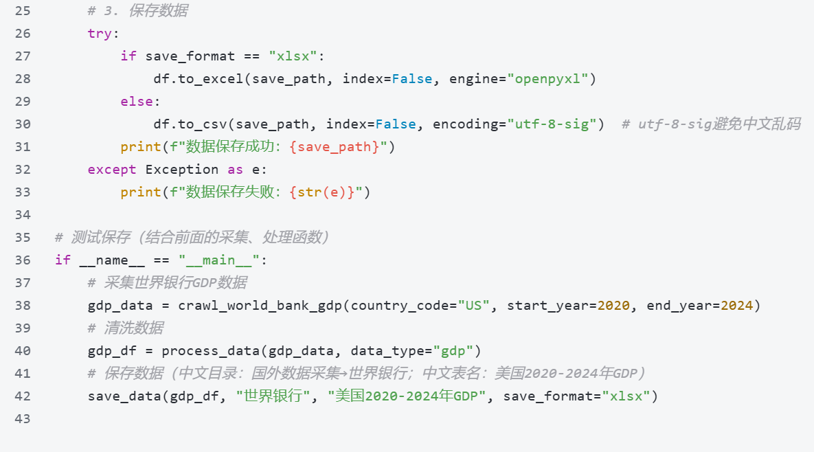 目录/文件名规范化:用Python的os库创建目录,按"中文网站名称-中文数据类型"命名目录(如"世界银行-全球GDP数据"),数据表按中文主题命名(如"2024年全球各国GDP排名.xlsx")。