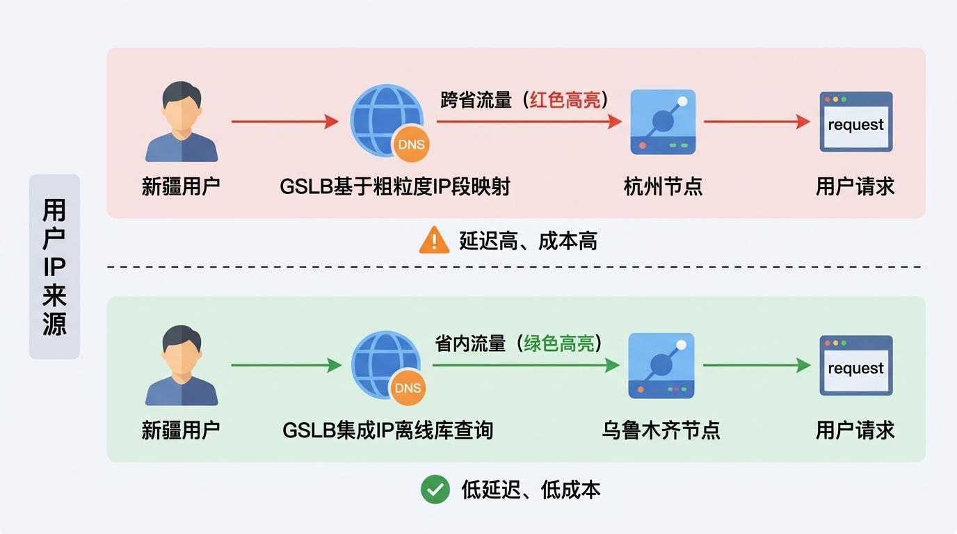 优化前,GSLB依赖粗粒度IP段映射,新疆用户的IP可能被误判为华东,DNS解析返回杭州节点。用户请求跨越大半个中国,带宽成本高,延迟大。