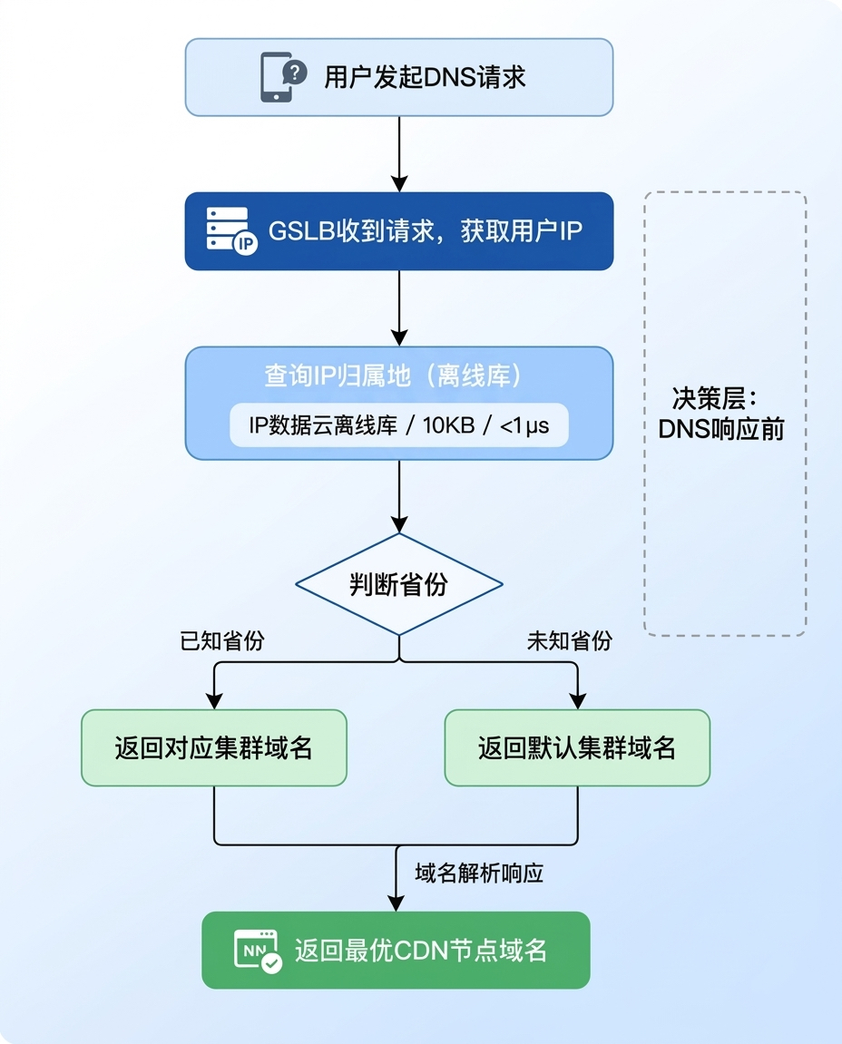 GSLB集成IP离线库决策流程:DNS请求→获取IP→查询归属地→判断省份→返回最优CDN节点域名
