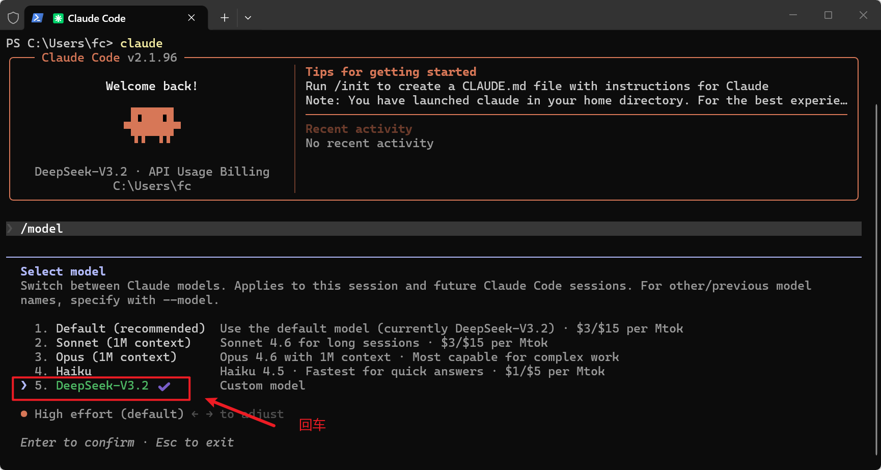 2、选择deepseek的模型,回车