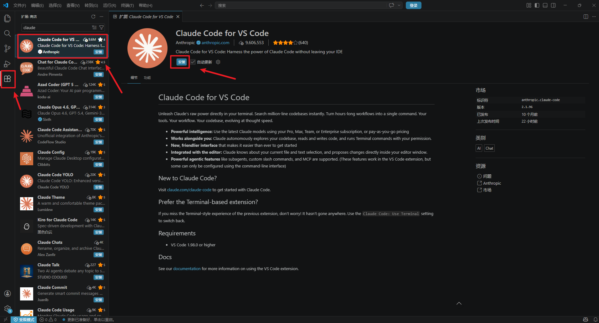 1、打开VScode,在插件里搜索claude code for vscode,然后安装(需要注意官方的版本标志:Anthropic)