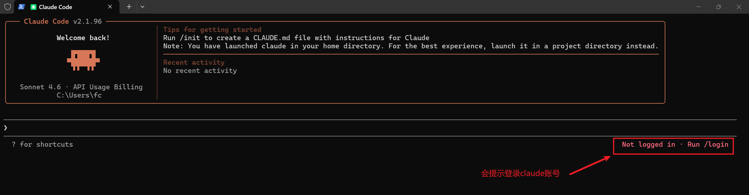 3、在命令行输入:claude(运行后,会提示我们需要一个验证,说明是可以运行的)