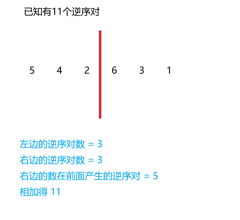 题目要求指定序列的逆序对数,既然要分治,我们把一个序列分成左右两个部分,分区来求逆序对,这样逆序数对 = 左边序列的逆序对 + 右边序列的逆序对 + 右边序列在左边序列产生的逆序对,如下例子