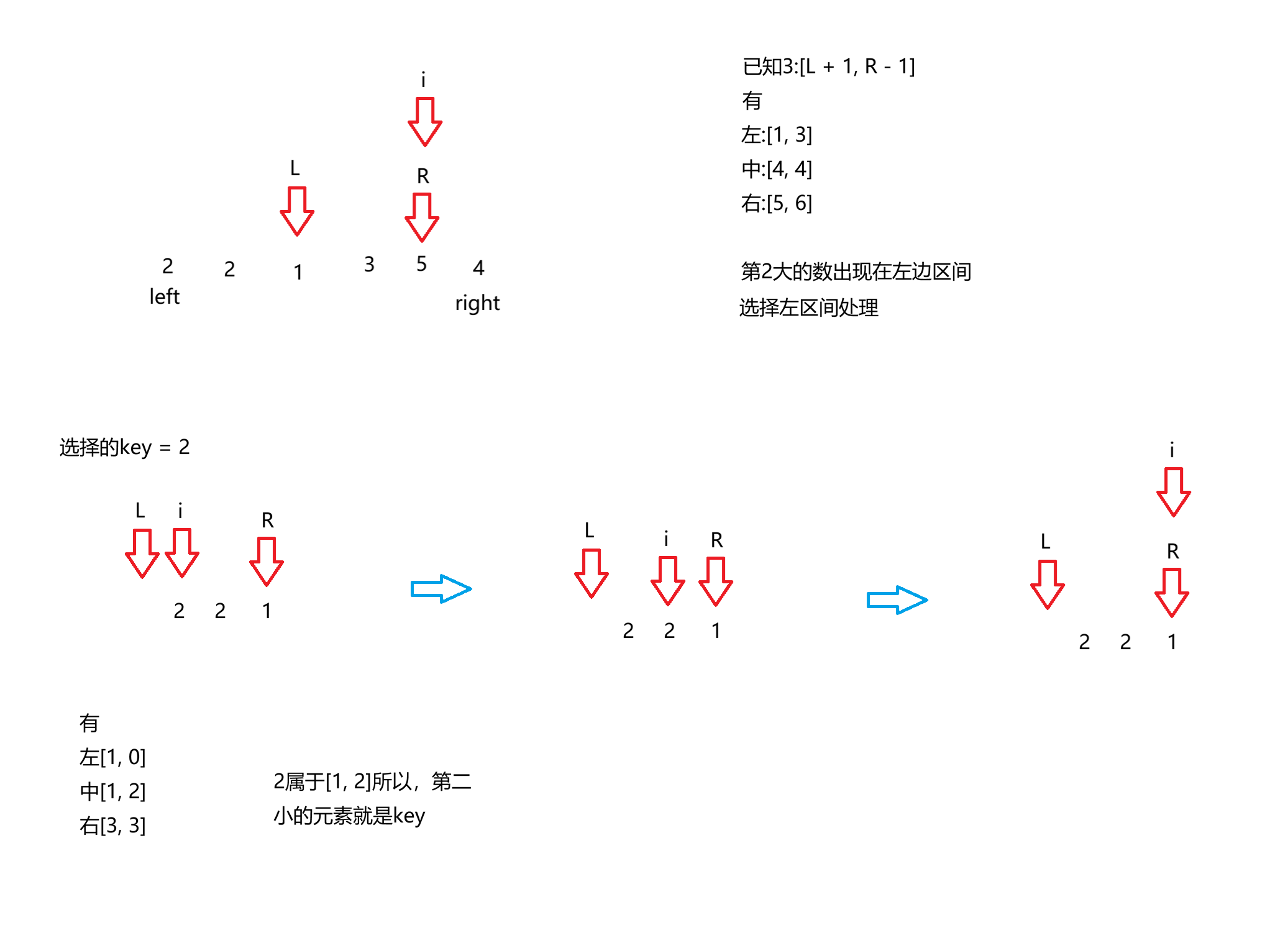 在之前学过的快速排序我们知道,如果排升序,选中一个key,如果在排好的序列中key在第 i 小的位置,那么进行一趟快排,key就会在第 i 小的位置,而key的左边全都是小于key的数,右边全是大于k的数。而下一趟则会从key的两边进行,刚好分为了三个部分[left, i - 1] [i, i + n] [i + n + 1, right](key可能会有多个)。我们可以类似操作来进行快速选择。