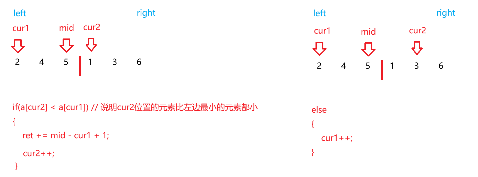 现在分类讨论,当 cur1 走到mid + 1时,说明a[cur2]始终是大的那个元素,所以cur2及后面的元素的逆序对皆为0;当cur2走到right + 1时,已经没有要求逆序对的元素。所以理论上来说,不需要对其进行处理,但是我们先把处理放一放,先来看看有序序列的得到。