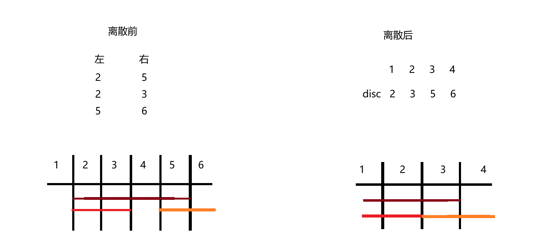 先用两个数组存储一个区间的两端,把数据全都存入一个离散化数组进行离散化,差分的时候通过离散前的数组取出离散后的两端进行操作,最后还原差分数组,根据还原出来的差分数组来计算长度。