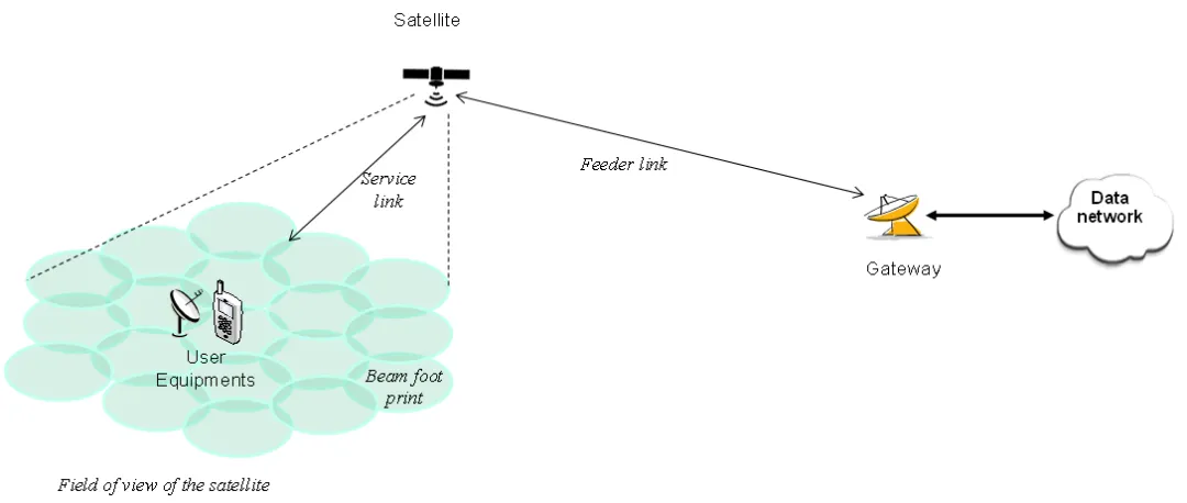 - 地面段(Ground Segment)及核心网 :位于图片左下方,主要由拥有巨大天线的地面站(又称为信关站),其作用是充当NTN和现有地面网络(如互联网)之间的桥梁,负责卫星与地面核心网之间的连接。