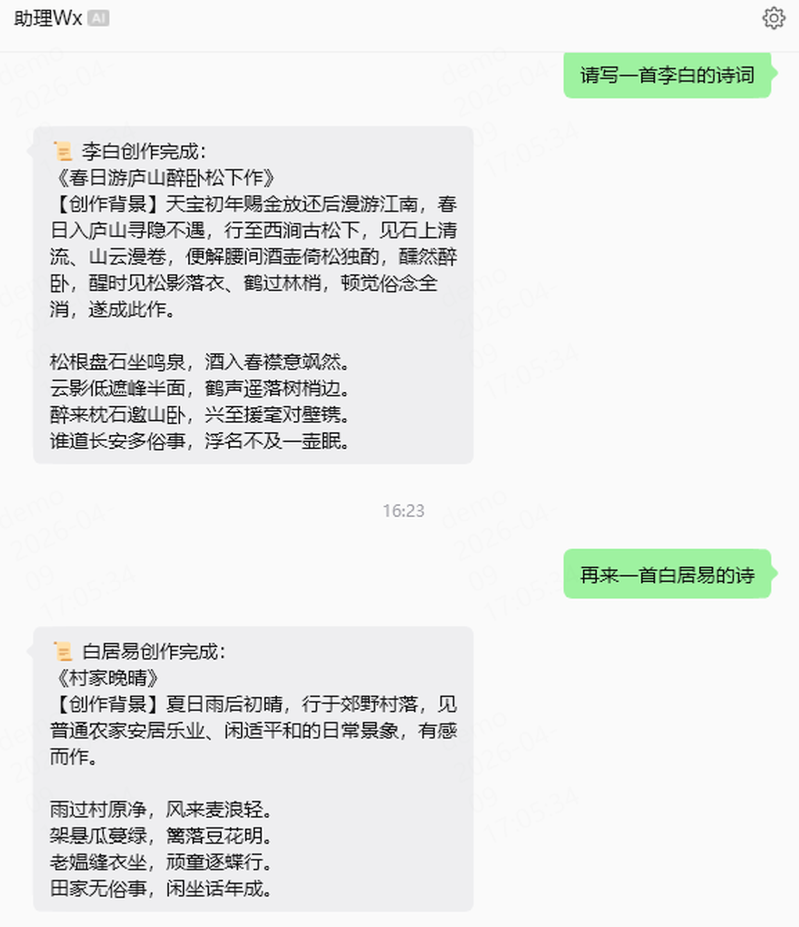 - 当用户请求白居易诗词时,调用baijuyi Agent