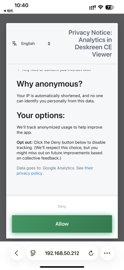 扫描后在手机上就可以看到弹出了隐私协议画面,如下图所示,直接点击允许即可。