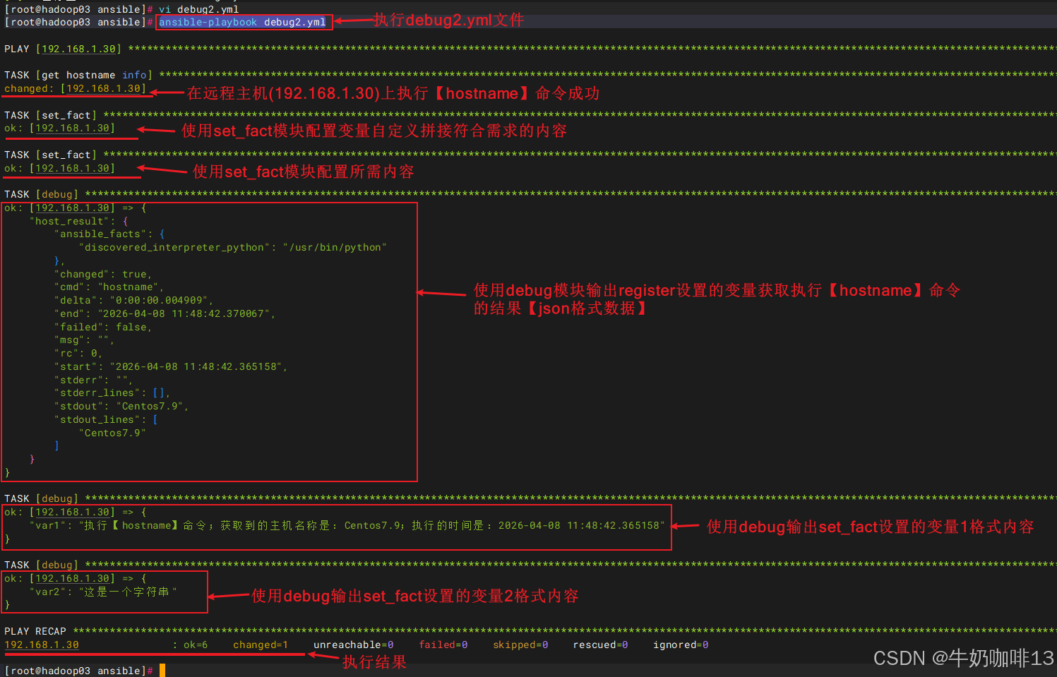 【register】与【set_fact】功能都是一样的,用于注册变量(即:可将前一个内容的输出作为一个变量,从而将其传递给后面使用)。【debug】是用于调试输出信息(其中debug: 'msg={``{变量1}} {``{变量2}} {``{变量3}} ...'的输出方式十分灵活),方便查看内容是否符合要求。
