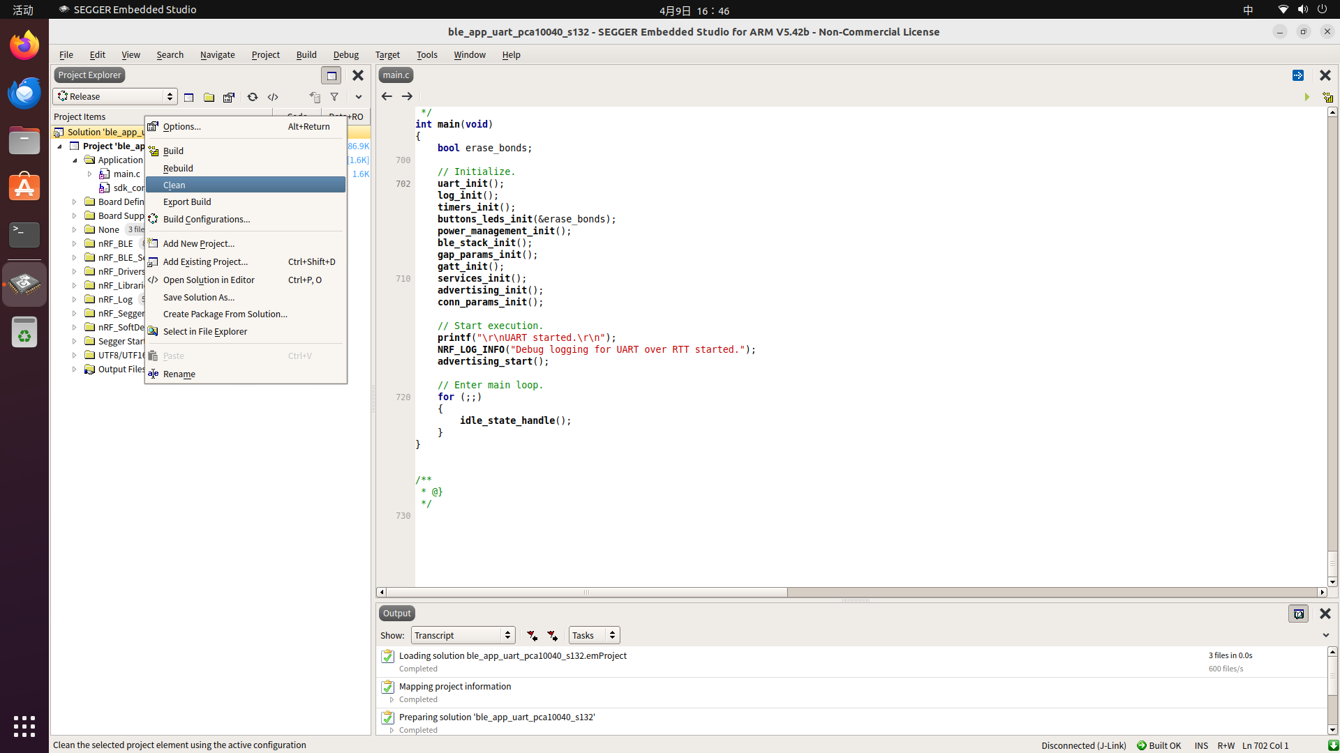 打开后看到了新的工程。右键点击左侧工程导航栏中的Solution名字的那一行,选择"Clean"先清理一下以前的工程: