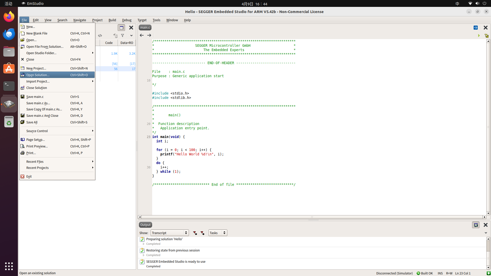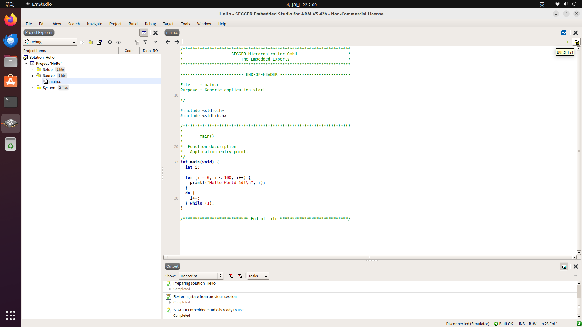 在Ubuntu 22.04系统下安装和使用SEGGER Embedded Studio的基本过程,除了安装指令需要注意外,其余与Windows系统下差别不大。