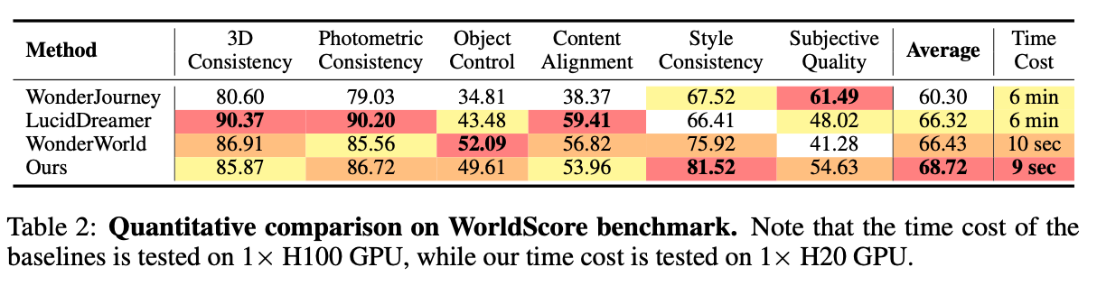 表2:WorldScore基准定量对比。注:基线方法的耗时在1×H100 GPU上测试,本文方法耗时在1×H20 GPU上测试。